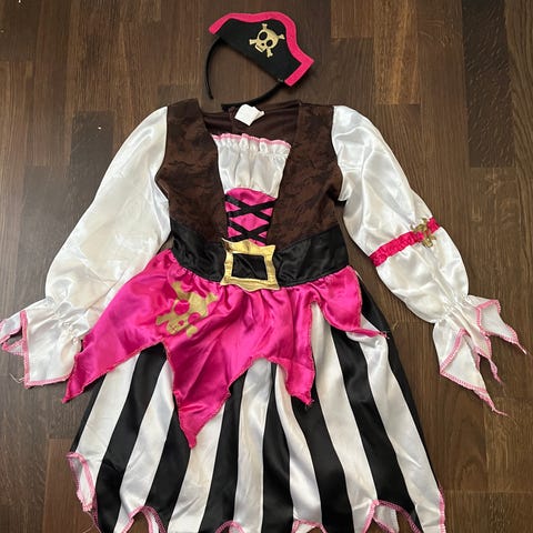 Halloweenasu tai naamiaisasu. Merirosvon mekko ja papukaija (solmittavissa esim. olkapäälle kainalon alta solmittavilla kuminauhoilla) ja kolmioliina päähän laitettavaksi huiviksi. Mukaan myös muovinen silmälappu jossa kuminauhakiinnitys. Olisko n 7-8 vuotiaalle sopiva. Meillä hais käyttää 9 vuotiaana isompi jolloin pikkusisko 6 v käytti tätä päällänsä myös :)
