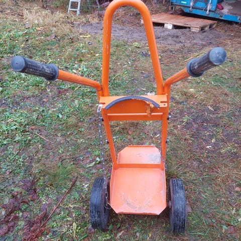 Maitokärry, jossa on metallirunko ja siniseksi maalattu puupohja. Kärry on tukeva ja kestää painavien tavaroiden siirtämisen. Sopii erilaisten tavaroiden kuljettamiseen ulkona.