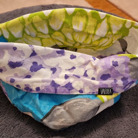 Myydään uusi, lapullinen ihana Vallilan kankainen leipäkori. Halkaisija 22 cm, korkeus 16 cm. Nouto keskusta tai postitus kirjeenä. Mobilepay käy myös. mmm