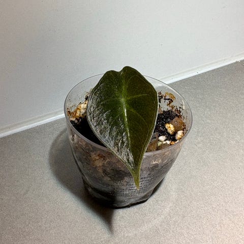 Myydään viimeisissä kuvissa oleva Alocasia Shattered Glass kasvuun lähtenyt pikkutaimi. Uudessa lehdessä näkyy myös jo varia.