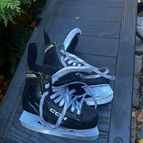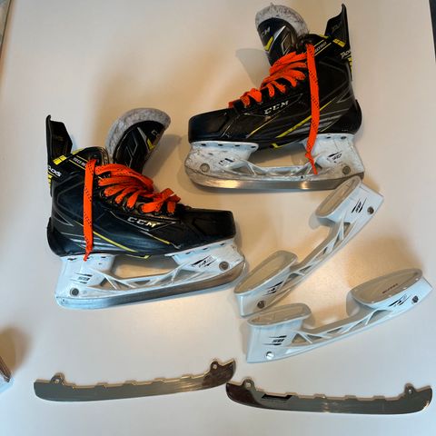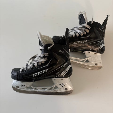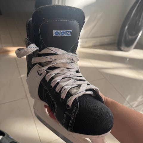 CCM jääkiekko luistimet lasten koossa 38. Värit musta ja punainen. Luistimissa on valkoinen nauhoitus ja teräksiset terät. Sisävuori on pehmeä ja vaalean värinen, tarkoitettu lasten käyttöön jääkiekossa.