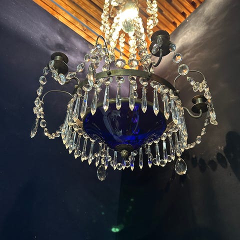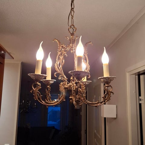 Vanha ja painava 8 haarainen kattovalaisin/kattokruunu. Hieno messinkinen runko upeilla yksityiskohdilla. Uudet himmennettävät polttimot ja myös polttimon "kynttilätupet" uusittu. Toimiva valaisin jonka ainoa miinus on muovinen kattokuuppa..