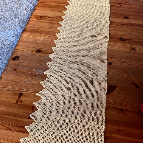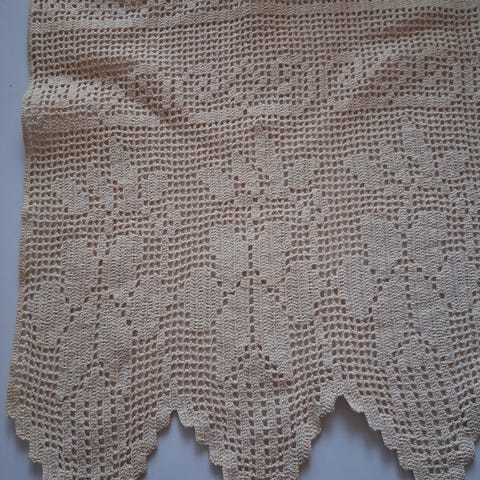 Virkattu kermanvärinen kappa (180 x 50) ja siihen kuuluva keltainen ohut harsoverho ( 296 x 214). Siistit ja pestyt.