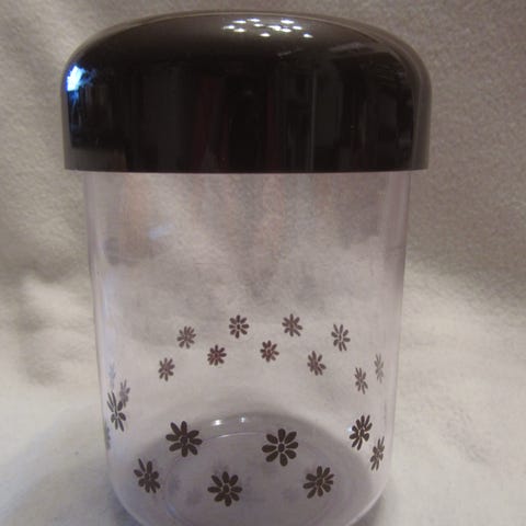 Rasian yhdessä kulmassa viimeisen kuvan mukainen halkeama. Purkeissa ei halkeamia. Jokaisessa reilusti käyttökulumaa. Koriste säilynyt hyvänä.