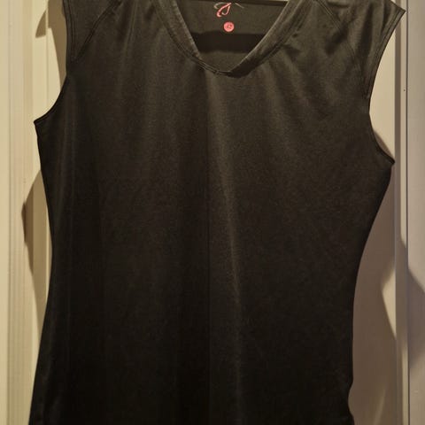 Musta urheilutoppi, käytetty vain pari kertaa, kuin uusi. Olkaimet jatkuvat selän yläosaan asti, eli yläselkä avoin. Koko M/L.