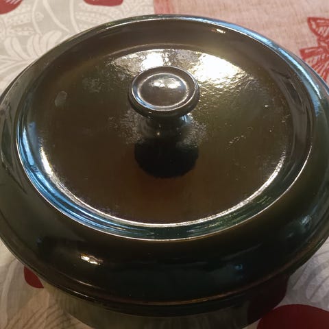 Lähes käyttämätön punainen valurautapata teflon pinnalla. Kannessa parilointi pinta.