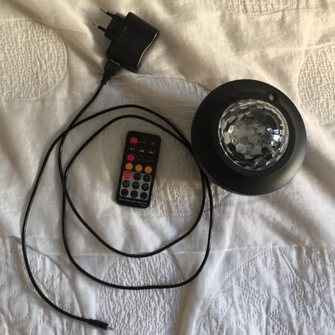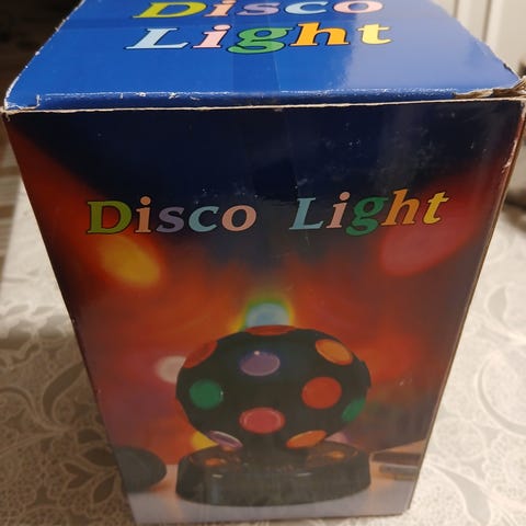 Diskopallo tuomaan iloa. Pallo pyörii ja totta kai tuottaa eri värisiä valoja. Pallon sisällä olevan valon voi vaihtaa tarvittaessa jos se menee rikki. Pyöriessä kuuluu pientä surinaa mutta se on normaalia.