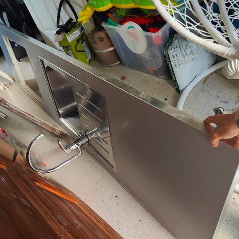 Keittiön työtaso, mitat 60 x 262 cm, lieden ja altaan aukko valmiina. Rosterisen altaan ja suihkupäähanan saa kaupan päälle. Saarekkeen taso, mitat 120 x 120 cm, graniittipintainen.