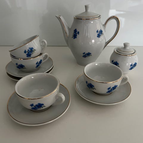 Myynnissä 7 -osainen keraaminen lasten astiasto 1960-luvulta. Astiat ovat valkoisia, niissä on kultainen reunus sekä kukkia ja kupeissa ja kannussa lapsi, joka tuoksuttelee kukkia tai pitää kukkia kädessä. Astiastoon kuuluu 1 ehjä kuppi ja 2 kahvatonta, 4 lautasta, sekä kahvikannu ja kansi. Kuppien pohjassa lukee 109/10. Mittoja: kupin korkeus n. 5 cm ja yläreunan halkaisija n. 6 cm. Lautasen halkaisja n. 10 cm. Pyydä lisäkuvia, jos jokin mietityttää!