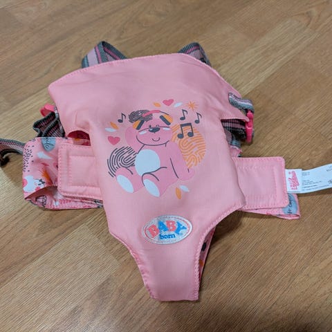 Baby Born Kantoreppu, nukke ja asusteet. Mukana on kantoreppu, 2x vaatekertaa, helistin, tuttipullo, kylpyankka, ruokalappuja x2 ja muita lisävarusteita. Lapset käyttäneet kantoreppuna myös selkäosa eteenpäin. Paljon leikitty kantoreppu. Myydään settinä!