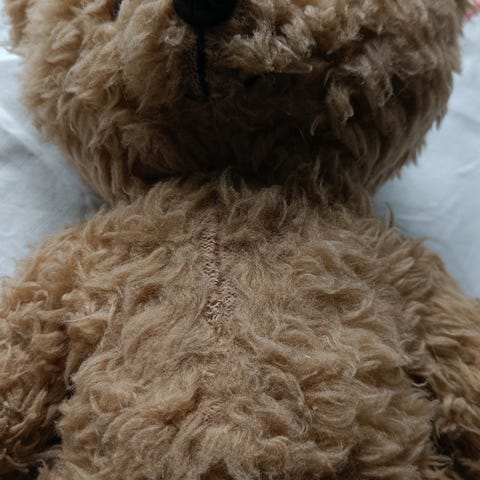 Nallukan vartalo kovaa materiaalia (guttaperkkaa? kovaa pahvia/levyä?), jonka päälle "turkki" liimattu, päällä valkoinen nuttu. Nutun alla rinnassa tuntuu toimimaton äänilaite tms. Jalat ja kädet kiinni rautalangalla.