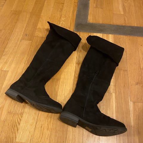 Mustat paksupohjaiset Bershkan saappaat, ostettu täältä mutta olivat itselleni liian suuret. Kokomerkintä 38, mutta vastaavat enemmän 39. Sisämitta n.25cm, lesti melko leveä. Keinonahka paikoittain kulunut, varsinkin kengän sisäosassa, käytön jäljet näkyvät kuvissa.