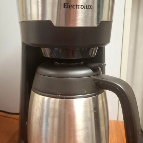 Sammuu itsestään kun kahvi on valmis. Termari on kätevä pitämään kahvin kuumana. (Muista ennen kahvin laittoa huljauttaa termari kuumalla vedellä) Väriltään musta ja ollut vähällä käytöllä.