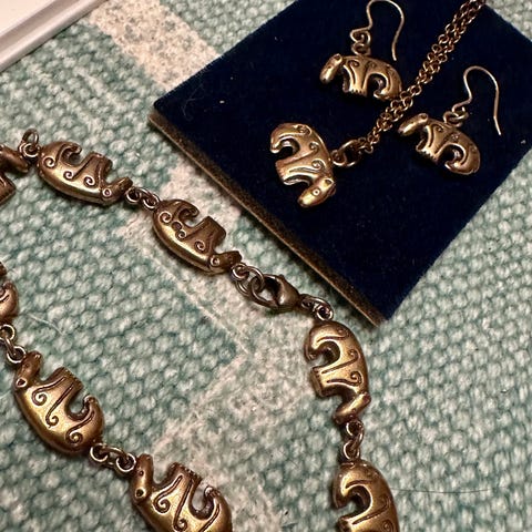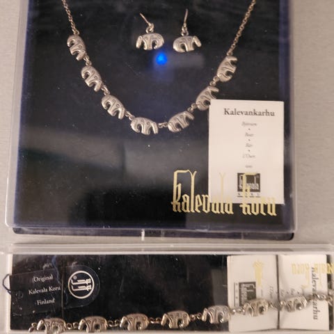 Kalevan karhu korut. Kääty 45 cm, korvakorut ja sormus settinä.Pronssia.