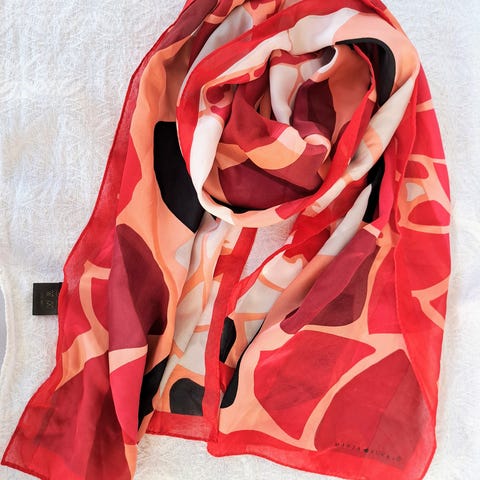 Kaunis sinisävyinen kuvioitu Marja Kurki 100% silkkihuivi. Käytetty, mutta edelleen hyvässä kunnossa, siisti ja ehjä sekä puhdas.