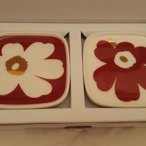Ostan Marimekon ruskeita unikko lautasia, 5dl kulhoja ja mukeja