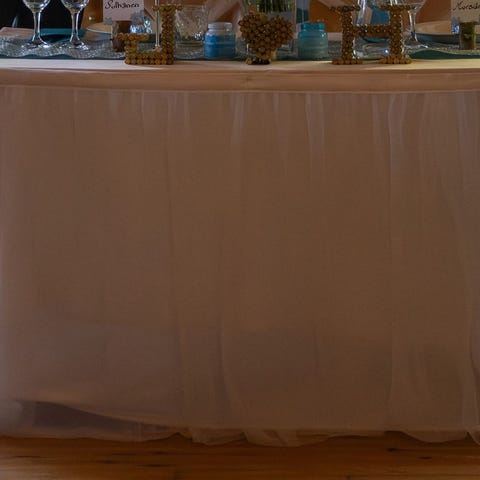Häissä ollut pöydän helmaliina, tarranauhalla. Täysin tahraton ja ehjä, kuin uusi. Reunaliparetta on n150cm, itse helmaa n70cm korkeutta. Loppu tulee eteen maahan kauniisti laskokselle.