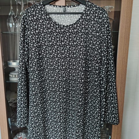 Freequent midimekko joustamatonta viskoosia. Kuosi kaunis kasviprintti, väreinä valkoinen, musta ja vihreä. Koko pieni XL, kai-kai 56cm, vyötärön poikkileikkaus 55cm, helman leveys 72cm ja halkiot antavat väljyyttä, olka-helma 117cm. 3/4-hihoissa nappitampit, joilla voi säädellä pituutta. Hyvät taskut. Osanapitus ja v-kaula-aukko. Erittäin siisti. 13e. Mmm