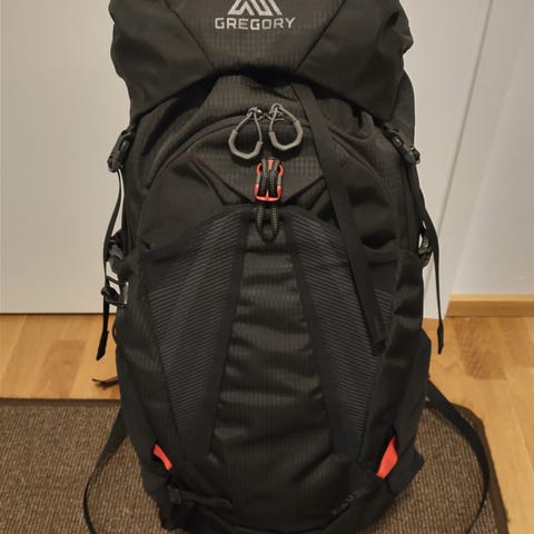 Todella hyvässä kunnossa oleva n. 30-35 litrainen reppu. Yksittäisiä pieniä käytön jälkiä on esim. hiusnaarmuja muoviosissa, ja metallisoljissa maalia kulunut, mutta ei mitään rakenteellista.