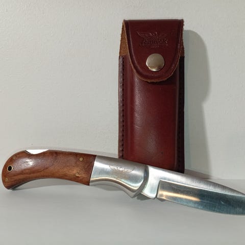 Saksalainen klassikkoveitsi Mercator, perusversiosta poiketen upeilla "smoked oak"-tammikahvalevyillä. Kauppaan kuuluu myös jämäkkä nahkainen vyökotelo. Kokonaispituus 19,7 cm. Terän pituus 8,8 cm. Pituus kiinni 11 cm. Terä C75 hiiliteräs.