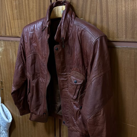 Spessu vihreä-musta nahkatakki. Ei merkintöjä tai kokolappua. Hienot napitetut hihansuut. Vetoketju toimii. Nepparien merkki johtaa Saksaan ja moottoripyörävarusteisiin. Oisko tää nyt sitä vintagea…