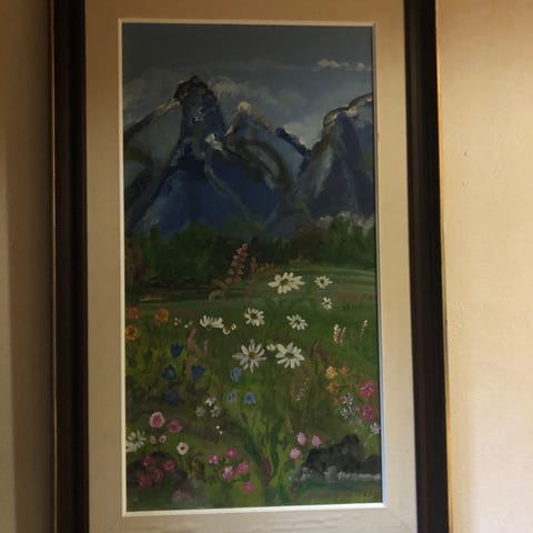 Öljyvärimaalaus, joka esittää maisemaa mökkeineen. Allekirjoitettu J. V. Pajala ja päivätty vuoteen 1937. Upea puukehys ympäröi teosta, korostaen sen luonnonläheistä teemaa.
