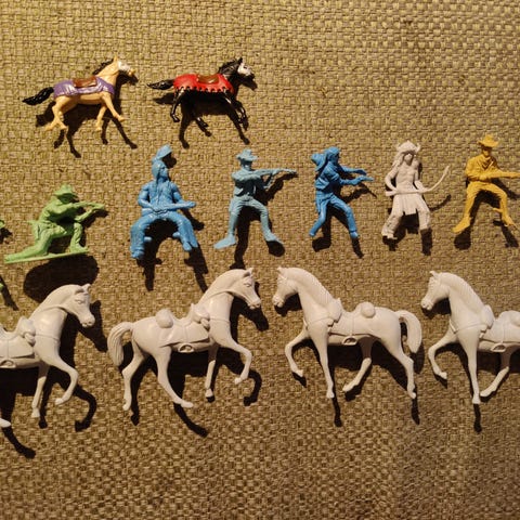 Suuri paketti vanhoja intiaanihahmoja, rekvisiittaa, aitoja, hevosia yms..