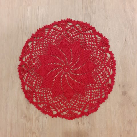 Joulun punainen uusi pyöreä virkattu pitsiliina. Oikea väri näkyy parhaiten tuossa ulkona otetussa kuvassa missä muitakin pitsiliinoja.