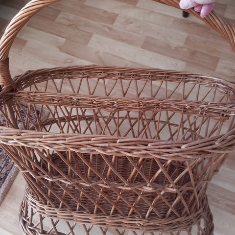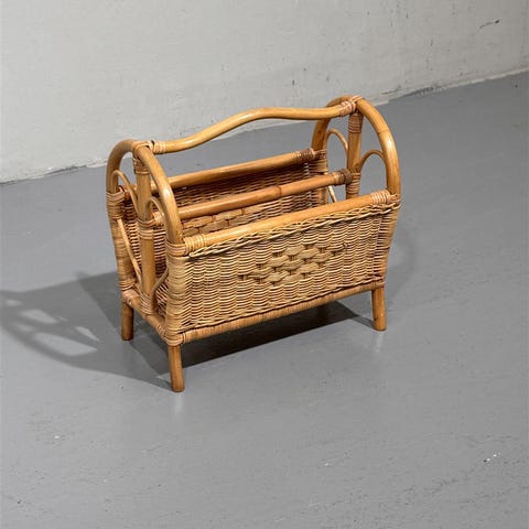 Rottinkinen lehtiteline, joka on valmistettu tummasta rottingista. Sen muotoilu on yksinkertainen ja käytännöllinen, ja se sopii hyvin lehtien tai aikakauslehtien säilytykseen. Telineessä on kaarevat kahvat, jotka helpottavat sen siirtämistä paikasta toiseen.Tämä lehtiteline edustaa rustiikkista tyyliä, joka on tunnettu luonnonmateriaalien käytöstä ja maanläheisestä estetiikasta. Rustiikkinen tyyli on suosittu erityisesti maalaishenkisessä sisustuksessa, jossa arvostetaan yksinkertaisuutta ja luonnonläheisyyttä.Telineessä on näkyvissä kulumia ja pieniä naarmuja, jotka kertovat sen käytöstä. Rottinki on paikoitellen hieman kulunut, mutta teline on edelleen tukeva ja käyttökelpoinen.