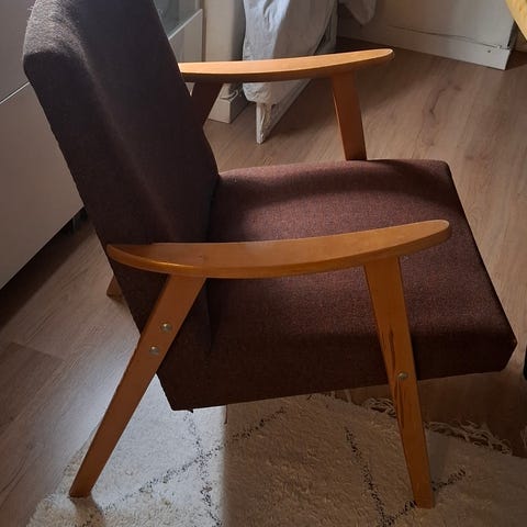 Hakusanat: vintage, retro, istuin, sisustus, nojatuoli, kangas, ruskea, huonekalut, puujalat, käytetyt huonekalut, vintage huonekalut