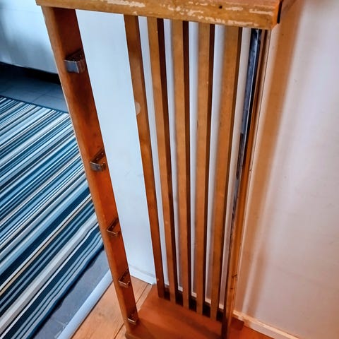 Puu-Metallinen hattuhylly, jossa on useita tankoja. Hylly on suunniteltu kiinnitettäväksi seinään, ja se tarjoaa käytännöllisen säilytysratkaisun esimerkiksi eteiseen tai vaatehuoneeseen. Hyllyn päädyt ovat puuta, mikä tuo siihen lämpimän ilmeen.Puussa selkeää kulumaa ja metallin pinta hapettunut. Vaatii putsauksen.