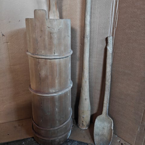 Antiikkinen puukirnu, leipälapio ja mäntä