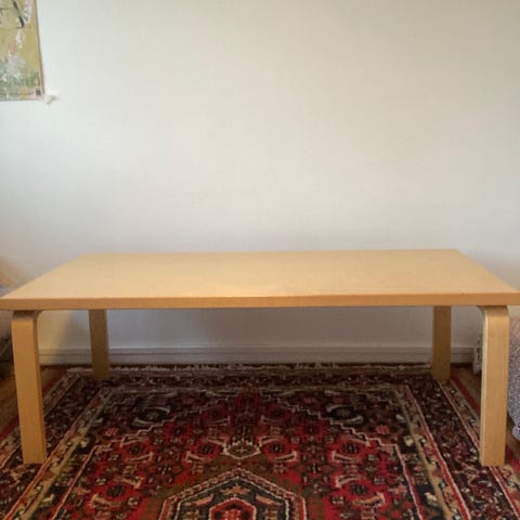 Tyylikäs Artek Alvar Aalto sohvapöytä malli 84. Pöydässä on selkeälinjainen muotoilu ja se on valmistettu vaaleasta puusta, joka tuo esiin Aallon tunnetun funktionalistisen tyylin. Pöydän L jalat ovat kauniisti kaareutuvat, mikä on tyypillistä Aallon suunnittelulle. Pöydän pinnassa on näkyvissä hieman kulumisen merkkejä, kuten reunanaarmuja.