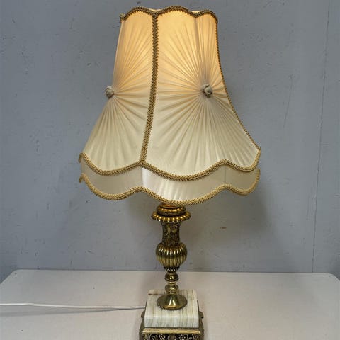 Tyylikäs Lasipaino Oy:n valmistama vintage pöytävalaisin, jossa on messinkinen runko ja kupolimainen muovivarjostin (oletettavasti varjostin vaihdettu jossain vaiheessa). Valaisimen jalka on muotoiltu pallolla ja messingillä kaarevasti, mikä antaa sille ainutlaatuisen erikoisen ilmeen. Valaisimen metalliosat ovat kiiltävät ja niissä on hienostunut rei'itetty kuviointi.Maadoittamaton pistoke.