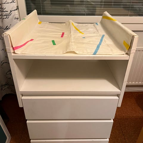 Moderni Muurame Molla hoitotaso pehmusteella, valkoinen, jossa on yksinkertainen ja selkeä muotoilu. Pöydässä on muovipehmustettu yläosa ja avoin hylly alhaalla, mikä tarjoaa käytännöllistä säilytystilaa. Valkoinen väri tuo raikkautta ja sopii monenlaisiin sisustuksiin. Kunto on todella siisti ja hyvä, mutta pehmusteen pinnassa pieniä kulumia käytön jäljiltä.