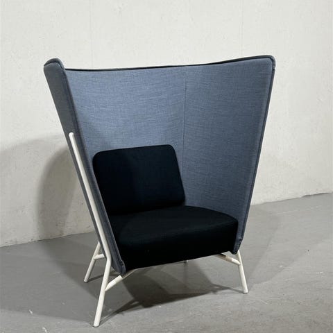 Moderni Inno Aura M nojatuoli, jossa on sinivihreä kangasverhoilu ja mustat metallijalat. Korkea selkänoja ja istuinosa ovat pehmustettuja, tarjoten mukavan istumakokemuksen. Korkeat sivut antavat tuolille yksityisyyttä ja suojaa ympäristön häiriöiltä.Tämä nojatuoli edustaa modernia retrotyyliä, joka yhdistää 60-luvun muotoilun ja nykyaikaiset materiaalit. Tyyli on saanut vaikutteita skandinaavisesta minimalismista, jossa korostuvat selkeät linjat ja käytännöllisyys.Tuoli on hyvässä kunnossa, mutta kankaassa voi olla pieniä käytön jälkiä. Metallijalat ovat tukevat ja naarmuttomat. Kokonaisuus on siisti ja käyttövalmis.