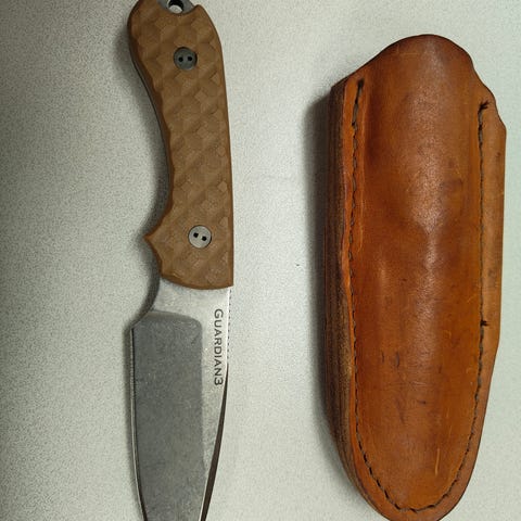 440C terä muistaakseni, nahkakahva voi vaatia hieman öljyämistä.