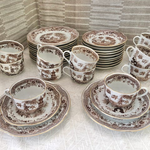 Arabia Singapore kahvikupit 42-osaa. Pikkukruunuleima 1964-71Kuppi, tassi ja pullalautanen kaikkia 21 kpl.Tassi halkaisija 13.5 cm. Pullalautanen halkaisija 17 cm.Pääkuvassa puolet astioiden kokomäärästä.