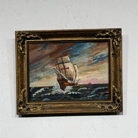 Öljyvärimaalaus, joka esittää rauhallista jokimaisemaa. Kuvassa on puinen rakennus veden äärellä ja vehreää metsää taustalla. Taivas on pilvinen, mutta valoisa, luoden harmonisen tunnelman. Kehys on yksinkertainen ja puunvärinen, mikä korostaa teoksen luonnonläheisyyttä. Ei signeerausta.Tyyli on realistinen, keskittyen luonnon yksityiskohtiin ja valon leikkiin veden pinnalla. Tällaiset maisemamaalaukset ovat olleet suosittuja erityisesti 1800-luvulta lähtien, kun taiteilijat alkoivat arvostaa luonnon kauneutta ja sen ikuistamista.Kehyksessä on hieman kulumaa ja maalauspinnassa voi olla pieniä naarmuja, mutta yleisilme on siisti. Värit ovat säilyneet kirkkaina ja teos on hyvin säilynyt.