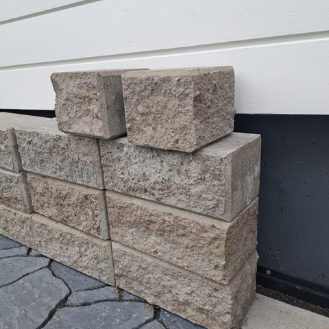Harmaa betoni muurikivi. Yksi täyslavallinen plus irrallisia. Uusia.