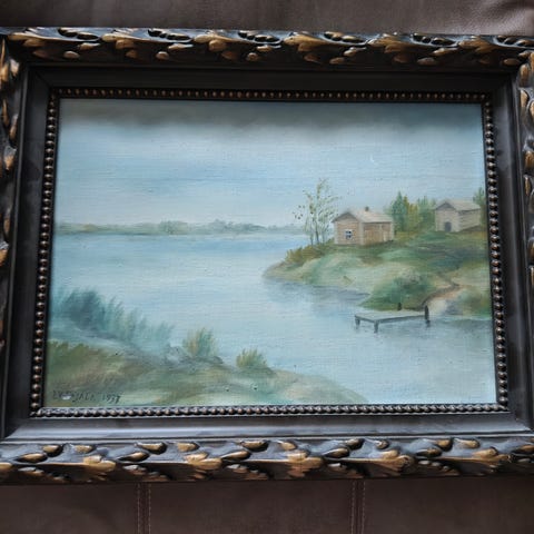 Öljyvärimaalaus, joka esittää rauhallista jokimaisemaa. Teos on signeerattu ja päivätty vuodelta 1948, mikä antaa sille historiallista arvoa. Maalauksessa on käytetty pehmeitä ja luonnollisia sävyjä, jotka tuovat esiin luonnon kauneuden ja rauhallisuuden.Tyyli on perinteinen maisemamaalaus, joka korostaa luonnon yksityiskohtia ja valon leikkiä veden pinnalla. Tällaiset teokset ovat olleet suosittuja eri aikakausina, ja ne tuovat tilaan rauhallista ja ajattoman kaunista tunnelmaa.Kehyksessä on näkyvissä kulumaa ja pieniä halkeamia, mikä viittaa sen ikään. Maalauksen pinta on säilynyt hyvin, mutta kehyksen kunto heijastaa sen pitkää historiaa.