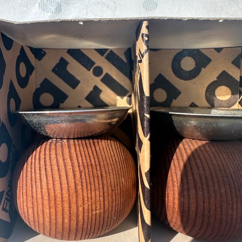 Aarikka tiikki/metalli kynttilänjalat/pidikkeet ohuille kynttilöille 10kpl.Alkuperäisessä laatikossa.