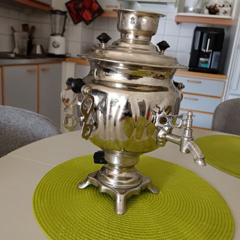 Metallinen samovaari, jossa on koristeelliset kahvat ja jalat. Kansi on irrotettava ja siinä on koristeellisia aukkoja. Sisäpuolella on lämmityselementti, joka on hieman kulunut/hapettunut käytön jäljiltä. Ei virtajohtoa.