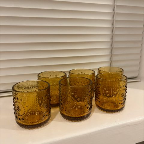 Riihimäen lasin Grapponia-sarjan juomalasit, 6kpl. Väri ruskea. Korkeus n7,5cm ja halk n6,5cm.