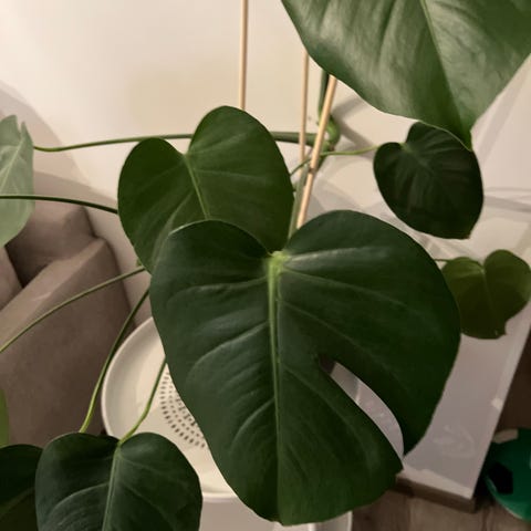 Monstera Deliciosa on viherkasvi, joka tunnetaan suurista, rei'itetyistä lehdistään. Kasvi sopii sisätiloihin ja vaatii kohtalaista valoa ja säännöllistä kastelua. Kuvissa näkyvä kasvi on istutettu harmaaseen ruukkuun ja tuettuna tukikeppiin. Ruukussa myös uusi kasvin alku.