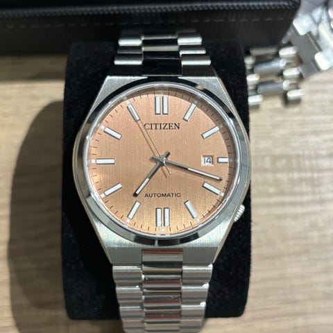 Pari vuotta vanha automaattinen Citizenin rannekello tummansinisellä taululla.