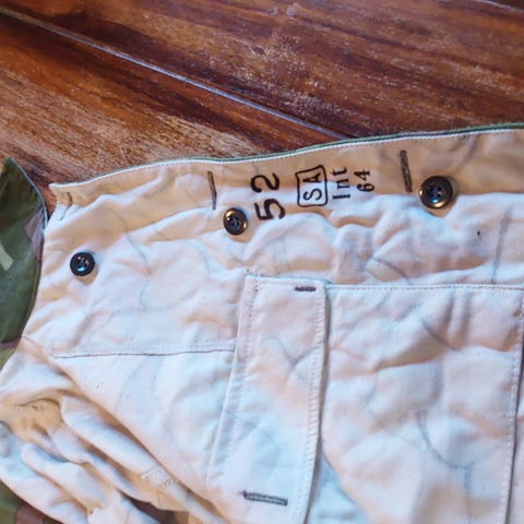 Tämmöinen maastopuku olisi tarjolla takki on kaksipuoleinen jossa on taskuja kummallakin puolella ja takissa on myös huppu kaulukseen piilotettu koko on 56 hihan sisäpituus 52cm lahkeen sisäpituus 85cm ja housuissa on vyötäröstä resori voidaan lähetää jos maksat posti maksun