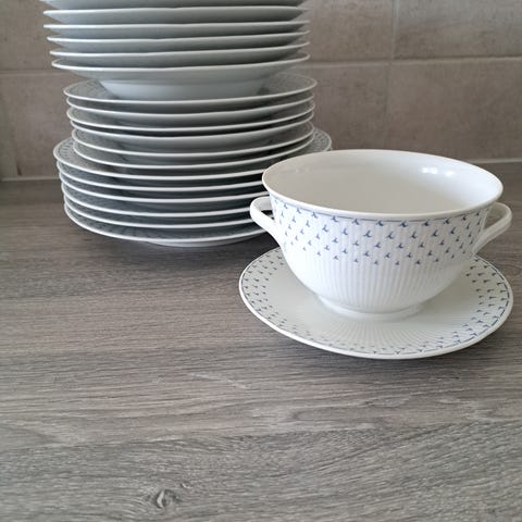 Rörstrand astioita. 4kpl ruokalautasta, halkaisija 24 cm. 6kpl syvää lautasta halkaisija 20 cm. 5 kpl lautasta, halkaisija 18 cm. 2 kpl tarjoiluvuokaa, koot 27x34 cm ja 18x38 cm. Kannu, vetoisuus 1 litra ja pieni kastike kulho.