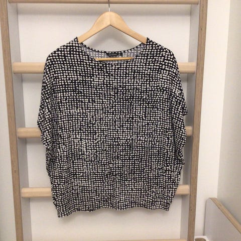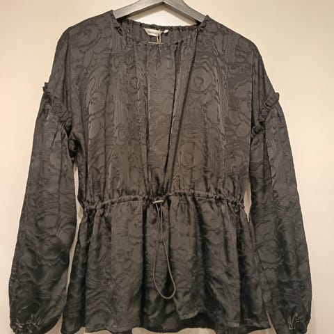 Marimekon kaunis ja tyylikäs eleellinen karuselli pusero. 65% viskoosi, 35% polyester. Ilmava ja kauniisti laskeutuva materiaali, josta kuultaa aavistuksen läpi. Ihana karuselli kuvio kirjailtu paitaan. Pitkät hihat, kaunis kiristysnyöri vyötäröllä, kuminauharypytys pääntiellä ja hihansuissa, tiputetut hartiat. Koko L, reilu. Kai-kai 66cm, olka-helma 63cm. Erinomainen kunto.