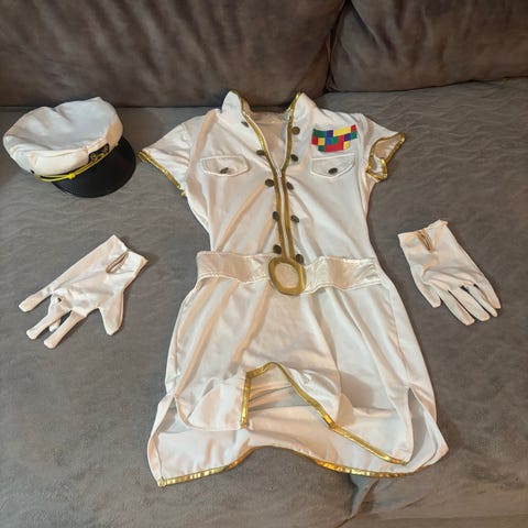 Mukana mekko, sukkahousut, sukkanauha, rannenauha, päähine ja pölyhuiska.